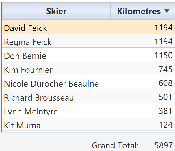 Honourable mentions to first year members David and Regina Feick for coming second on the list (with the most diverse skiing destinations, too). Also, Club President, Lynn McIntyre got out on the skis an impressive number of times to cover 305 kms! Well done!