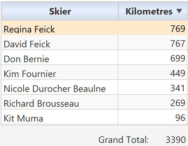 Honourable mentions to first year members David and Regina Feick for coming second on the list (with the most diverse skiing destinations, too). Also, Club President, Lynn McIntyre got out on the skis an impressive number of times to cover 305 kms! Well done!